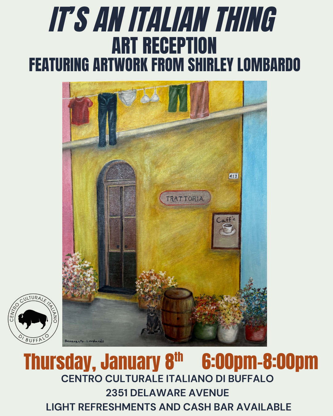 Home Events - Centro Culturale Italiano di Buffalo It’s an Italian Thing ft. Artwork from Shirley Lombardo | Art Reception It’s an Italian Thing ft. Artwork from Shirley Lombardo | Art Reception Register Now Date Jan 08 2026 Expired! Time 6:00 pm - 8:00 pm