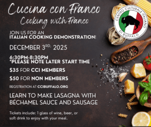 Home Events - Centro Culturale Italiano di Buffalo Cucina con Franco Cucina con Franco Register Now Date Dec 03 2025 Time 6:30 pm - 8:30 pm Location Centro Culturale Italiano di Buffalo 2351 Delaware Ave