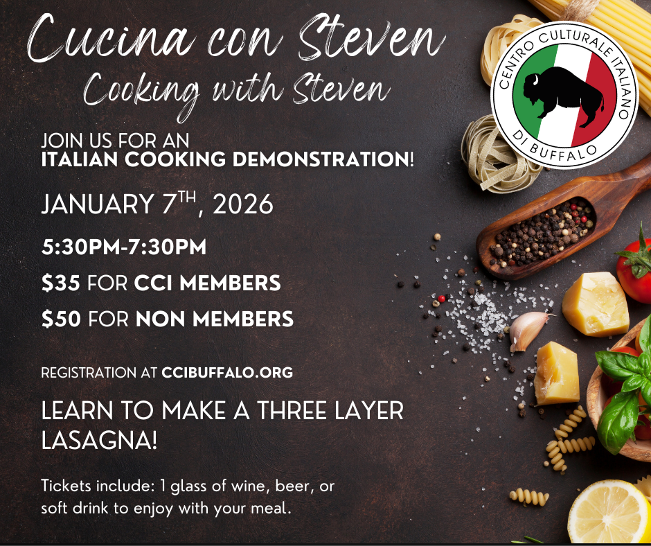 Home Events - Centro Culturale Italiano di Buffalo Cucina con Steven Cucina con Steven Register Now Date Jan 07 2026 Expired! Time 5:30 pm - 7:30 pm