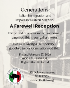 Home Events - Centro Culturale Italiano di Buffalo Exhibit Closing Reception Exhibit Closing Reception Register Now Date Feb 27 2026 Time 6:00 pm - 8:00 pm Location Centro Culturale Italiano di Buffalo 2351 Delaware Ave