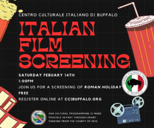 Home Events - Centro Culturale Italiano di Buffalo Italian Film Screening | New Date 2/14 at 1PM Italian Film Screening | New Date 2/14 at 1PM Register Now Date Feb 14 2026 Time 1:00 pm - 3:00 pm Location Centro Culturale Italiano di Buffalo 2351 Delaware Ave