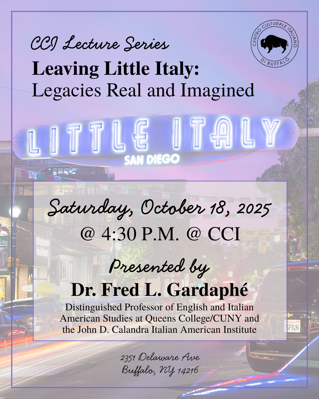 Home Events - Centro Culturale Italiano di Buffalo Lecture | Leaving Little Italy: Legacies Real and Imagined Lecture | Leaving Little Italy: Legacies Real and Imagined Register Now Date Oct 18 2025 Expired! Time 4:30 pm - 5:30 pm