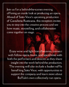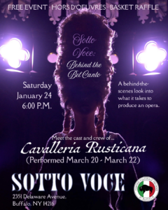 Home Events - Centro Culturale Italiano di Buffalo Sotto Voce: Behind the “Bel Canto” Sotto Voce: Behind the “Bel Canto” The Centro Culturale Italiano di Buffalo proudly hosts: Sotto Voce Behind the Bel Canto Register Now Date Jan 24 2026 Time 6:00 pm - 8:00 pm Location Centro Culturale Italiano di Buffalo 2351 Delaware Ave