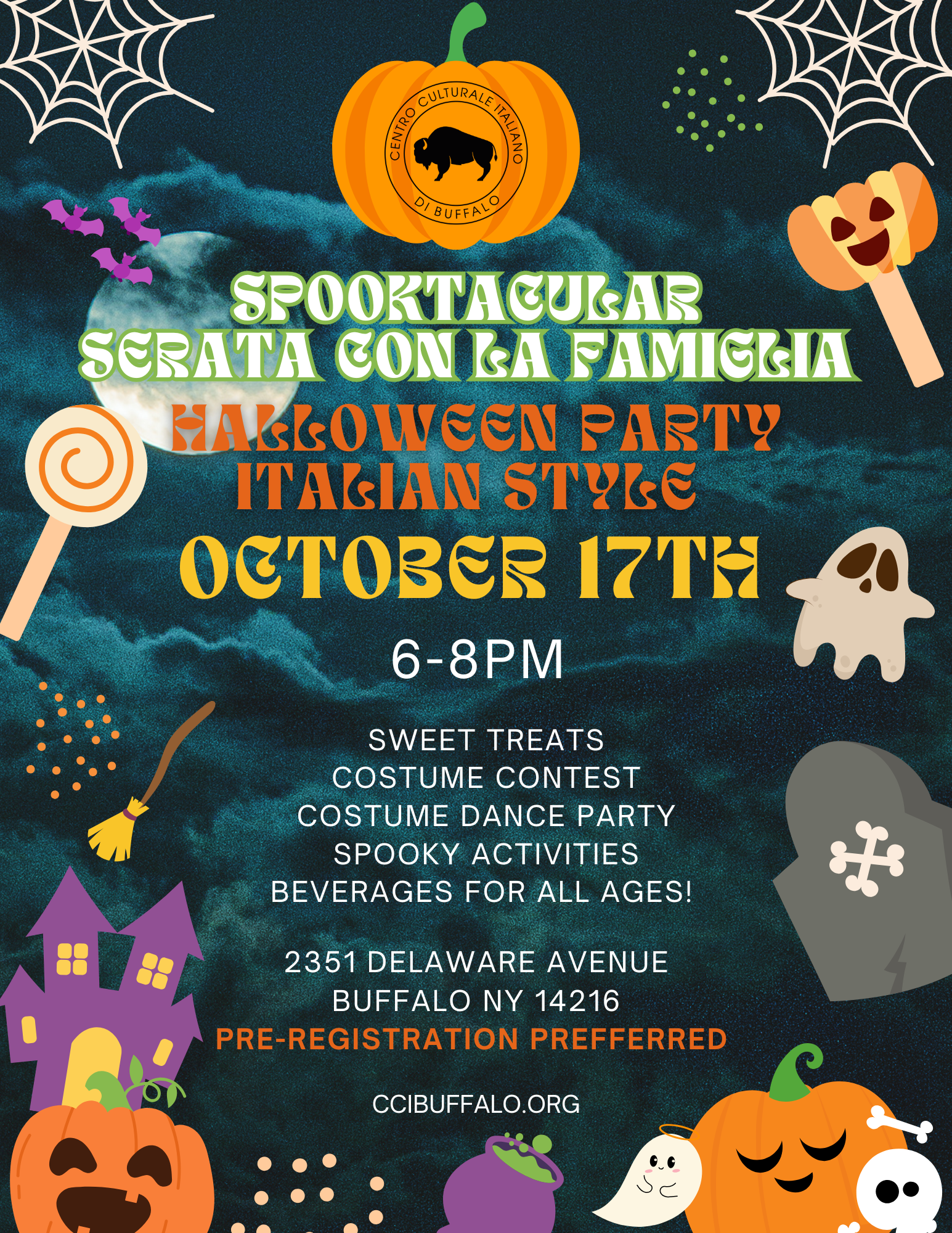 Home Events - Centro Culturale Italiano di Buffalo Spooktacular Serata con la Famiglia Spooktacular Serata con la Famiglia Spooky Fun for the WHOLE Family!! Register Now Date Oct 17 2025 Time 6:00 pm - 8:00 pm Location Centro Culturale Italiano di Buffalo 2351 Delaware Ave