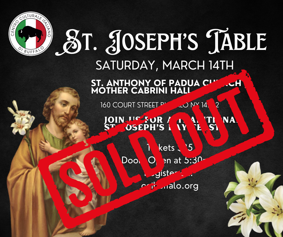 Home Events - Centro Culturale Italiano di Buffalo St. Joseph’s Table St. Joseph’s Table Table seating is available with the purchase of 10 tickets. Register Now Date Mar 14 2026 Time 5:30 pm - 9:00 pm Location St. Anthony's of Padua | Mother Cabrini Hall 160 Court Street Buffalo 14202